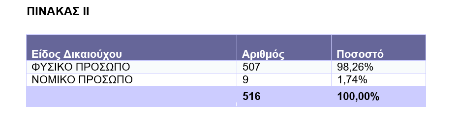Η συνολική κατανομή των φυσικών και νομικών προσώπων εμφανίζεται στον παρακάτω πίνακα ΙΙ: