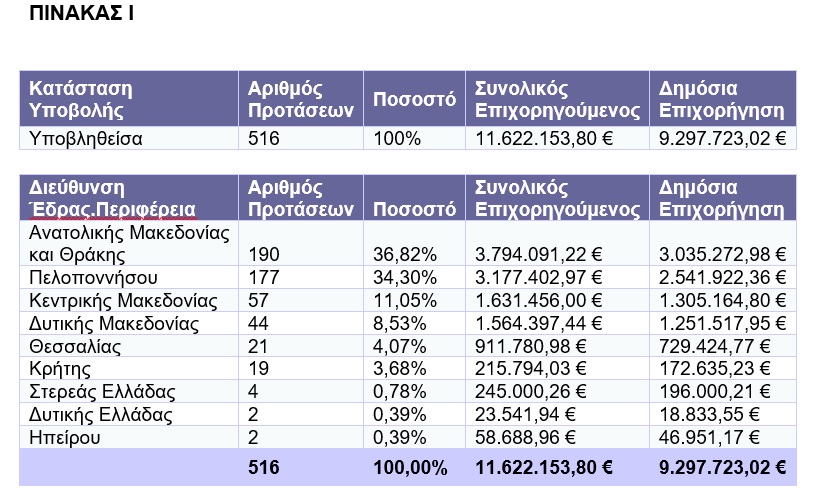Η συνολική κατανομή των τελικών αιτήσεων στήριξης αριθμητικά και ποσοστιαία ανά περιφέρεια, εμφανίζεται στον παρακάτω πίνακα Ι: