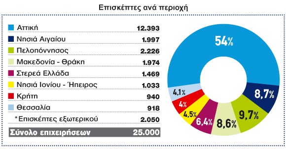 Στα παρακάτω γραφήματα παρουσιάζεται αναλυτικά η κατανομή των επισκεπτών ανά τομέα δραστηριότητας και ανά περιοχή και των ξένων επισκεπτών ανά ήπειρο: