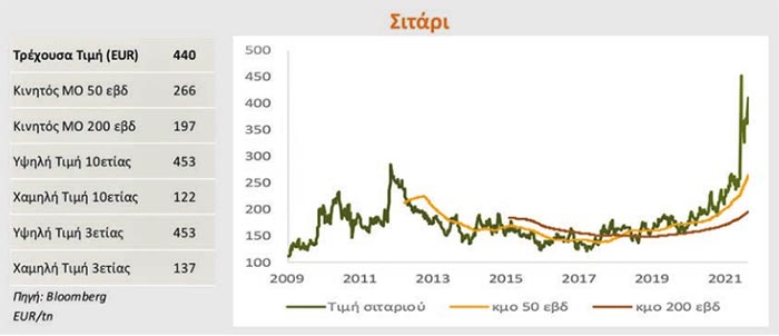 Για το σιτάρι οι αναλυτές της τράπεζας σημειώνουν ότι πιθανή εξομάλυνση στο θέμα της επιβολής εξαγωγικών περιορισμών από την Ινδία ενδεχομένως να περιορίσει τις θετικές αποδόσεις. Στα μέσα Μαΐου πάντως (16/5/2022), το σιτάρι κατέγραφε άνοδο 18% σε μηνιαία βάση.