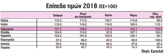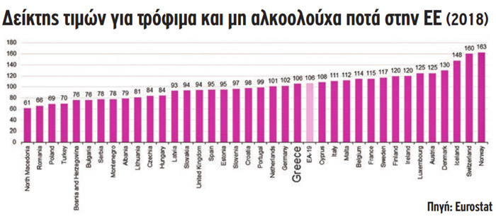 Σύμφωνα με τα πιο πρόσφατα στοιχεία της Eurostat, που επικαιροποιήθηκαν τον περασμένο μήνα (Δεκέμβριος 2019), οι τιμές των τροφίμων στην Ελλάδα το 2018 ήταν κατά 4,9% υψηλότερες από τον μέσο όρο της ΕΕ. Αν και το ποσοστό αυτό φέρνει τη χώρα μας λίγο πιο κάτω από τον μέσο όρο της Ευρωζώνης (συν 7% σε σχέση με τις τιμές στο σύνολο της ΕΕ), παραμένει υψηλότερο από χώρες όπως η Γερμανία (2,4% πάνω από τον ευρωπαϊκό μέσο όρο) και η Ολλανδία ( 1,1%) ενώ πολύ μεγαλύτερη είναι η απόσταση που χωρίζει την Ελλάδα από την Ισπανία και την Πορτογαλία, οι οποίες είναι κατά 9,3% και 7,7% αντίστοιχα φθηνότερες.
