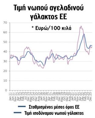 Μετά τα ιστορικά υψηλά του 2022 και τα σκαμπανεβάσματα του 2023 οι τιμές για το νωπό αγελαδινό γάλα σταθεροποιήθηκαν στις αρχές του 2024 σε επίπεδο άνω των 46 λεπτών ανά κιλό (+15% πάνω από τον μέσο όρο της προηγούμενης πενταετίας). Δεδομένης της σταθεροποίησης των τιμών εισροών και εκροών τα περιθώρια κέρδους μπορεί να διευκολυνθούν για τους παραγωγούς γαλακτοκομικών το 2024, εκτιμά η Κομισιόν.