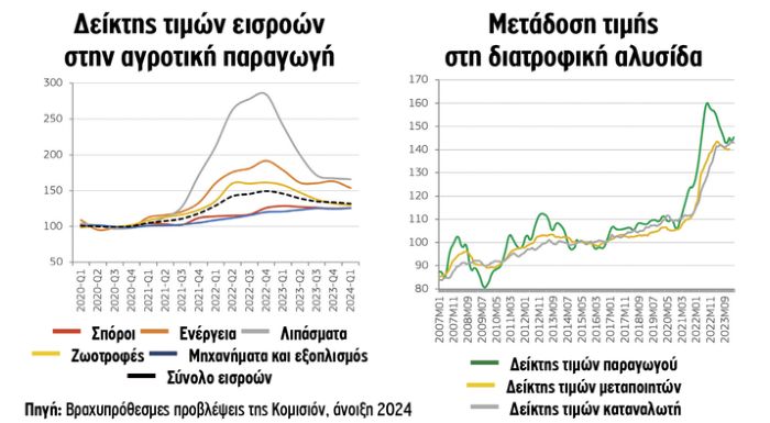 Πέρα από τις πιέσεις στις τιμές αρκετών προϊόντων τους, οι αγρότες έχουν να αντιμετωπίσουν, όπως τονίζει η Κομισιόν, και αρκετές προκλήσεις στο «μέτωπο» των εισροών, έστω και αν κάποιες από αυτές συνεχίζουν την πτωτική τους πορεία. Για παράδειγμα, το κόστος της ενέργειας υποχώρησε 6% το πρώτο τρίμηνο του 2024 σε σχέση με το τέταρτο τρίμηνο του 2023, ωστόσο πολύ μικρότερη ήταν η μείωση στα λιπάσματα και στις ζωοτροφές που δεν ξεπέρασε το 1% και το 1,5% αντίστοιχα.