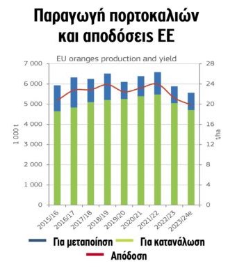 Η μικρότερη σε βάθος δεκαετίας παραγωγή που εκτιμάται φέτος για την ΕΕ (-5,4% από πέρυσι, στους 5,6 εκατ. τόνους) αποδίδεται από την Κομισιόν κυρίως στις κλιματικές συνθήκες, ιδιαίτερα στη μεγαλύτερη παραγωγό Ισπανία. Ωστόσο, οι εκτάσεις στην ΕΕ αυξήθηκαν 1,2% από πέρυσι και 2% σε σύγκριση με τον μέσο όρο πενταετίας, κυρίως στην Ιταλία και την Ελλάδα. Η μείωση στην παραγωγή φέρνει και χαμηλότερη διαθεσιμότητα προϊόντος, ενώ τα ποιοτικά ζητήματα αυξάνουν και το προϊόν που θα κατευθυνθεί στη μεταποίηση (+2,6% από πέρυσι), το οποίο όμως παραμένει σε χαμηλά επίπεδα (-13%) σε σύγκριση με τον μέσο όρο πενταετίας.
