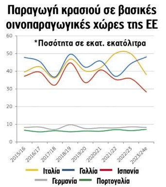 όρου της τελευταίας πενταετίας (170 εκατ. εκατόλιτρα). Με βάση τις τελευταίες εκτιμήσεις των κρατών-μελών, η ευρωπαϊκή παραγωγή το 2023/2024 προβλέπεται να υποχωρήσει επιπλέον στα 143 εκατ. εκατόλιτρα (-10% από πέρυσι), το χαμηλότερο επίπεδο από το 2017/2018. Η Ιταλία και η Ισπανία αναφέρουν σημαντικές μειώσεις (κατά 23% και 21%, αντίστοιχα), ενώ η Γαλλία –που κρατά ξανά τα σκήπτρα της μεγαλύτερης παραγωγού– και η Πορτογαλία αυξήσεις (+8% και +11% αντίστοιχα).