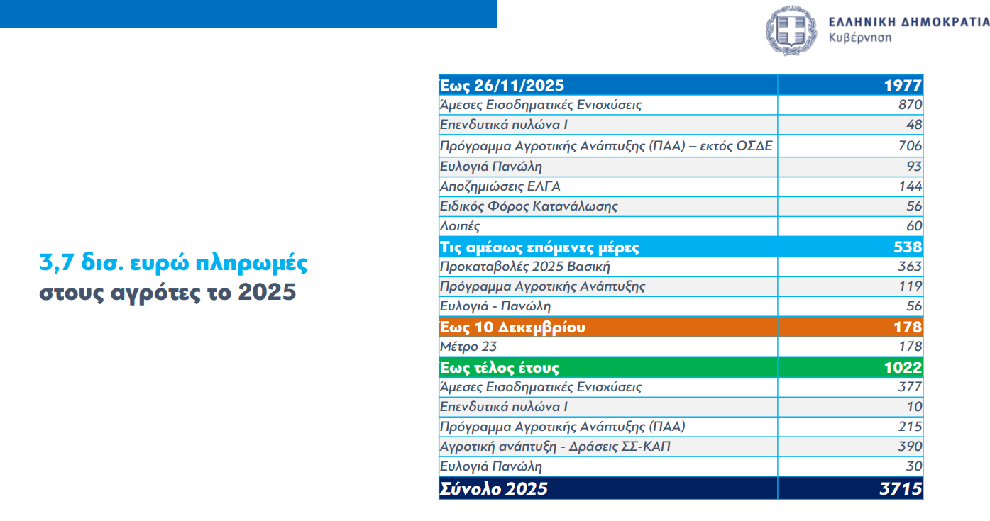 - το 2025 οι συνολικές πληρωμές προς τους αγρότες θα ανέλθουν στα 3,7 δισ. ευρώ.