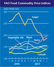 Αύξηση σε ποσοστό 5,2% (τον Ιούλιο) σημείωσε –σύμφωνα με τον Δείκτη Τιμών Τροφίμων του FAO– η διεθνής τιμή της ζάχαρης, σημειώνοντας ουσιαστικά την πρώτη μηνιαία ανοδική κίνηση από την αρχή του έτους. Ωστόσο, συνεχίζει να παραμένει σε αισθητά χαμηλότερα επίπεδα σε σχέση με την περσινή σεζόν (-26%). Οι αναλυτές του FAO αποδίδουν τη μικρή αυτή αυξητική τάση του Ιουλίου στην ποιοτική παραγωγή της Βραζιλίας (βλ. σχετικό διάγραμμα). Την ίδια στιγμή, στην Ελλάδα, τόσο το μέλλον της τευτλοκαλλιέργειας όσο και της Ελληνικής Βιομηχανίας Ζάχαρης (ΕΒΖ) βαδίζει σε τεντωμένο σχοινί, με τους παραγωγούς να ζητούν βοήθεια από την πολιτεία.