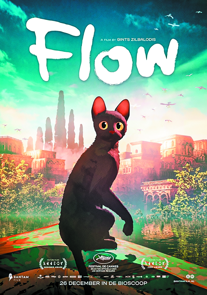 Ταινίας & Καλύτερου Animation), η ταινία κινουμένων σχεδίων «Flow – Η Γάτα Που Δεν Φοβόταν Το Νερό» (Χρυσή Αθηνά στις ελληνικές «Νύχτες Πρεμιέρας» του 2024) είναι πολλά διαφορετικά πράγματα στη συσκευασία του ενός. Μία άλλη εκδοχή του μύθου του κατακλυσμού και της Κιβωτού του Νώε και ταυτόχρονα μια παραβολή για την ανθρωπογενή κλιματική αλλαγή, χωρίς τη φυσική παρουσία του ανθρώπου (άγνωστη η μοίρα του είδους μας), αλλά με ξεκάθαρη ταύτιση των ζώων με ανθρώπινες συμπεριφορές. Ένα εικαστικά αξιοσημείωτο (τα εύσημα στον Λετονό κινηματογραφιστή Γκιντς Ζιλμπαλόντις για το ξεχωριστό στιλ του), συναισθηματικά έντονο και παραστατικό, υποδόρια ηθικοπλαστικό και διδακτικό, αλλά όχι δασκαλίστικο animation, για μικρούς και –κυρίως– μεγάλους. Έργο-ωδή στη φύση και τους μηχανισμούς αυτορρύθμισής της, με αιωρούμενο, εμφατικό ερωτηματικό για τον άνθρωπο, εμμέσως πλην σαφώς υπαίτιο της κρίσης, αλλά βολικά απόντα από τα απόνερά της, τουλάχιστον σε… πρώτη ανάγνωση.