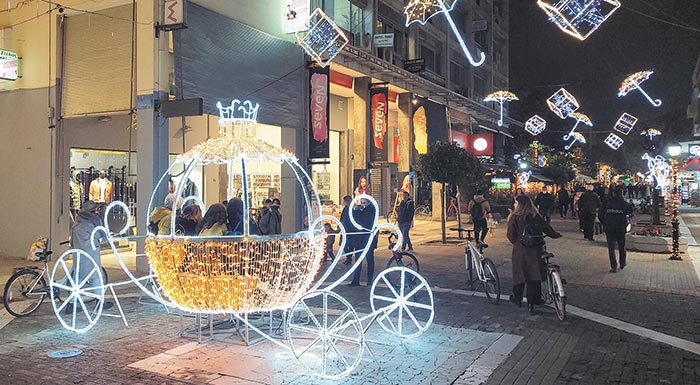 Ο υπέροχα στολισμένος ο κεντρικός πεζόδρομος, αλλά και χριστουγεννιάτικα στολίδια σε όλες τις γειτονιές, έχουν δημιουργήσει ένα μοναδικό κλίμα. Το νέο στοιχείο στον φετινό διάκοσμο είναι μια υπέροχη φωτεινή άμαξα (η κολοκύθα της Σταχτοπούτας) στη διασταύρωση του κεντρικού πεζόδρομου με την οδό Βάλβη (στον νοητό άξονα με το κτήριο της δημοτικής αγοράς).