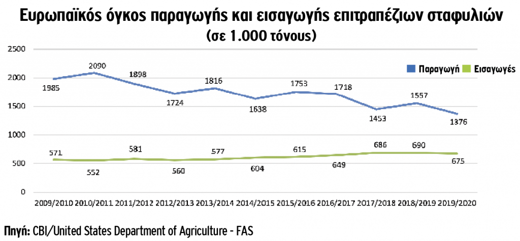 Η μείωση αυτή οφείλεται αφενός στο ότι η καλλιέργεια σταφυλιών γίνεται λιγότερο επικερδής λόγω αυξημένου καλλιεργητικού κόστους και αφετέρου στο ότι οι μη Ευρωπαίοι προμηθευτές της είναι ανταγωνιστικοί και αλληλεπικαλύπτονται με την ευρωπαϊκή παραγωγική περίοδο.