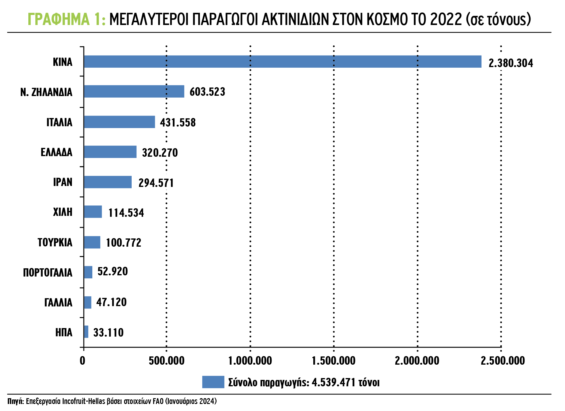 Το 2022 (σ.σ. τελευταία χρονιά επίσημων στοιχείων FAO) καλλιεργήθηκαν παγκοσμίως και συγκομίστηκαν 4,539 εκατ. τόνοι καρπών ακτινιδίων έναντι 4,467 εκατ. τόνων το 2021 (βλ. Γράφημα 1). Η Κίνα, με 2,380 εκατ. τόνους, αποτελεί τη χώρα με τον μεγαλύτερο όγκο παραγωγής ακτινιδίων, αντιπροσωπεύοντας το 53% της συνολικής παραγωγής.