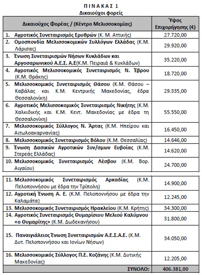 Σύμφωνα με την απόφαση του υπουργείου που δημοσιεύθηκε στη Διαύγεια, το μέγιστο ύψος επιχορήγησης της Δράσης 1.1 Λειτουργία Κέντρων Μελισσοκομίας» για το διάστημα από 01/08/2022 έως 31/12/2022 καθορίζεται σε 406.381,00 Ευρώ.