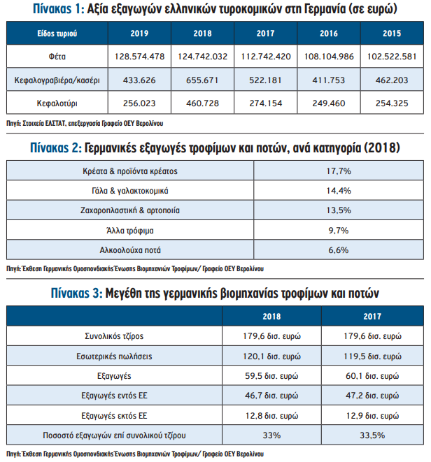 Για το 2019, οι εξαγωγές της ελληνικής φέτας ΠΟΠ αντιπροσώπευσαν περίπου το 90% των εξαγωγών τυροκομικών της χώρας μας προς τη συγκεκριμένη αγορά σε όρους αξίας, ενώ, γενικότερα, κατά την τελευταία πενταετία οι αποστολές της ελληνικής φέτας στη γερμανική αγορά κατέγραψαν μία σταθερά αυξητική τάση, έναντι της πορείας άλλων τύπων τυριών.