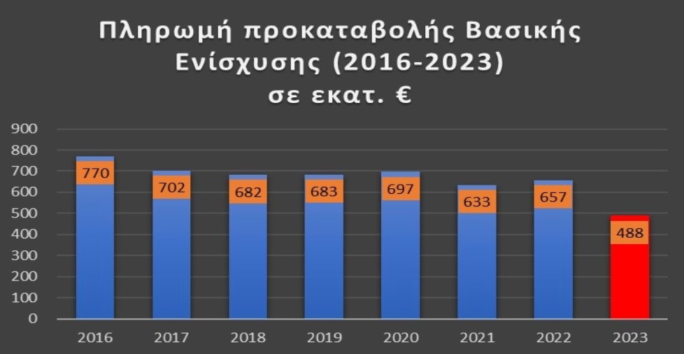 Το συνολικό εγκεκριμένο χρηματικό ποσό της Βασικής Ενίσχυσης για το 2023 ανέρχεται σε €829εκ.  μειωμένο κατά €239εκ. έναντι των €1.068 εκ. το 2022.