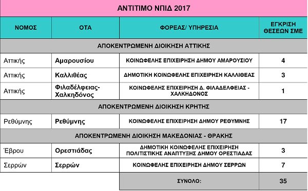 Συγκεκριμένα εγκριθηκε η σύναψη τριάντα πέντε (35) συμβάσεων μίσθωσης έργου, σε ΝΠΙΔ, για τη στελέχωση υπηρεσιών που παρέχουν έργο έναντι αντιτίμου από τους ωφελούμενους, σύμφωνα με τον πίνακα που ακολουθεί: