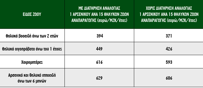 Το μέγιστο ύψος ενίσχυσης περιλαμβάνει το κόστος για την εκτροφή αρσενικών ζώων αναπαραγωγής με αναλογία ένα αρσενικό ζώο για κάθε 15 θηλυκά ζώα αναπαραγωγής που ανέρχεται σε 23 ευρώ/ΜΖΚ. Το μέγιστο ύψος ενίσχυσης καταβάλλεται εφόσον τηρείται η αναλογία 1 αρσενικό: 15 θηλυκά αναπαραγωγά ζώα. Εφόσον δεν τηρείται αυτή η αναλογία, το ύψος ενίσχυσης μειώνεται κατά 23 ευρώ ανά ΜΖΚ.