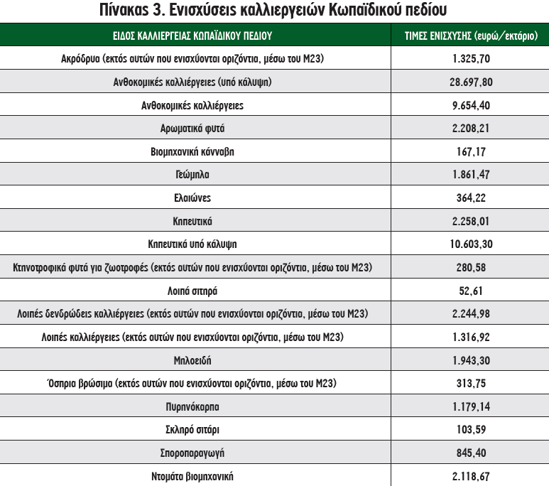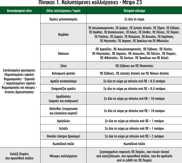 Η στήριξη θα λάβει τη μορφή ενός εφάπαξ κατ’ αποκοπή ποσού, με δικαιούχους ενεργούς γεωργούς, οι οποίοι εκπληρώνουν συγκεκριμένα κριτήρια επιλεξιμότητας, όπως ότι είναι εγγεγραμμένοι στο ΜΑΑΕ, έχουν υποστεί καταστροφή τουλάχιστον του 30% του σχετικού δυναμικού/παραγωγής τους, έχουν υποβάλει δήλωση ΟΣΔΕ έτους 2024 και δεν έχουν λάβει από άλλη πηγή αντίστοιχη ενίσχυση. Το πεδίο εφαρμογής του Μ23 ως προς το καταστροφικό αίτιο και την εδαφική κάλυψη απεικονίζεται στον Πίνακα 1, ενώ οι ενιαίες τιμές ανά εκτάριο/κυψέλη και τομέα/καλλιέργεια ενδεικτικά διαμορφώνονται όπως φαίνεται στον Πίνακα 2. Σε ό,τι αφορά τις ενισχύσεις καλλιεργειών Κωπαϊδικού πεδίου, αυτές απεικονίζονται στον Πίνακα 3.