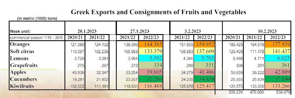 Στο μεταξύ, συνεχίζεται η συγκομιδή και εξαγωγή πορτοκαλιών και από 1/9/22-10/2/2023 οι εξαγωγές ανέρχονται σε 177.938 τόνους +8.2% και μανταρινιών με ρυθμούς ρεκόρ 141.437 τόνους +27,2% έναντι 202122.