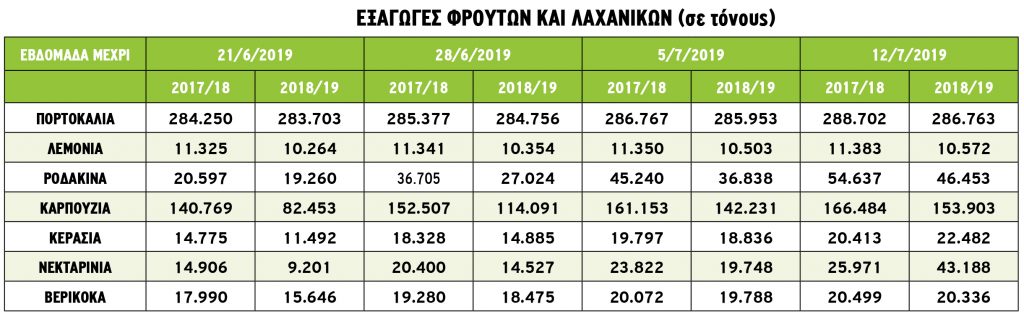 Σημειώνοντας αύξηση κατά 10,14% από την περίοδο 2017/2018, στους 22.482 τόνους υπολογίζεται ο όγκος των εξαγωγών κερασιών έως τις 12 Ιουλίου. Σε ότι αφορά τους όγκους βερίκοκων και ροδάκινων, για τα μεν πρώτα οι εξαγόμενες ποσότητες ήταν κατά 0,8% μικρότερες από τις αντίστοιχες περσινές, ωστόσο, μεγαλύτερη μείωση κατά 14,98 % σημείωσαν οι εξαγωγές των ροδάκινων, έναντι του προηγούμενου έτους. Αντίθετα, αύξηση κατά 66,29% σημείωσαν οι εξαγωγές νεκταρινιών από το αντίστοιχο διάστημα του 2017/2018.