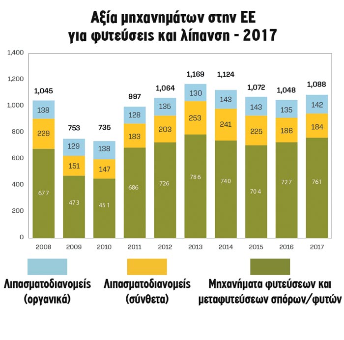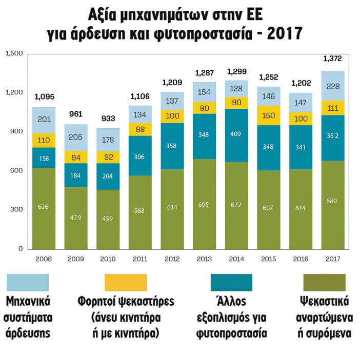 Αντίθετα, διαρκώς ανοδική είναι η αξία στα μηχανήματα άρδευσης και στα ψεκαστικά, όπου το 2017 η αξία των μηχανημάτων ανήλθε σε 1,37 δισ. ευρώ, το υψηλότερο νούμερο της δεκαετίας. Η άνοδος αυτή ενδέχεται να είναι και πλασματική σύμφωνα με τον ιδιοκτήτη κατασκευαστικής εταιρείας ψεκαστικών μηχανημάτων Βασίλη Ζαϊντούδη: «Αν και παρατηρούμε υψηλότερους τζίρους δεν έχουμε στοιχεία για τις πωληθείσες μονάδες ώστε να μπορούμε να είμαστε σίγουροι ότι πρόκειται για στοιχείο που δείχνει την άνοδο των τζίρων.