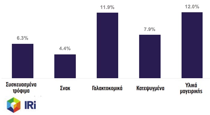 Συνολικά, η κατηγορία τροφίμων-ποτών εμφάνισε πέρυσι οριακή πτώση 0,3% στις πωλούμενες ποσότητες, ωστόσο ο τζίρος της ενισχύθηκε 6,5%, παρουσιάζοντας τη μεγαλύτερη αύξηση μεταξύ των προϊόντων σταθερού barcode (σ.σ. 4,7% ήταν το αντίστοιχο ποσοστό για τα προϊόντα προσωπικής υγιεινής και ομορφιάς και 3,1% για τα είδη οικιακής φροντίδας).