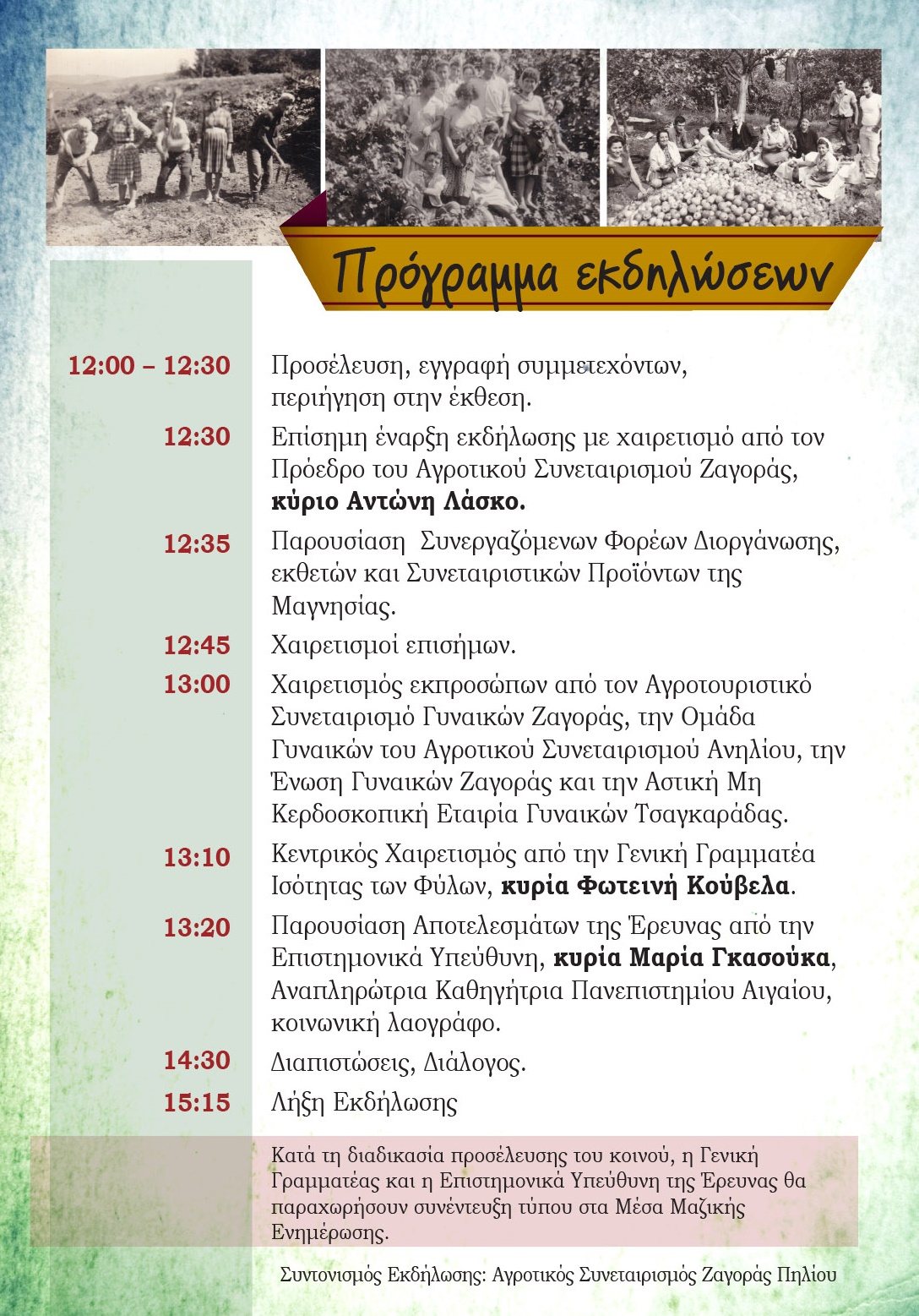 Η Γενική Γραμματεία Ισότητας των Φύλων και ο Αγροτικός Συνεταιρισμός Ζαγοράς Πηλίου, που είναι ευρέως γνωστός από το εμπορικό σήμα «ΖΑGORIN», διοργανώνουν την Παρασκευή 13 Απριλίου 2018 και ώρα 12:00, εκδήλωση για την πρώτη επίσημη παρουσίαση αποτελεσμάτων πανελλαδικής επιστημονικής έρευνας για την Ελληνίδα Αγρότισσα.