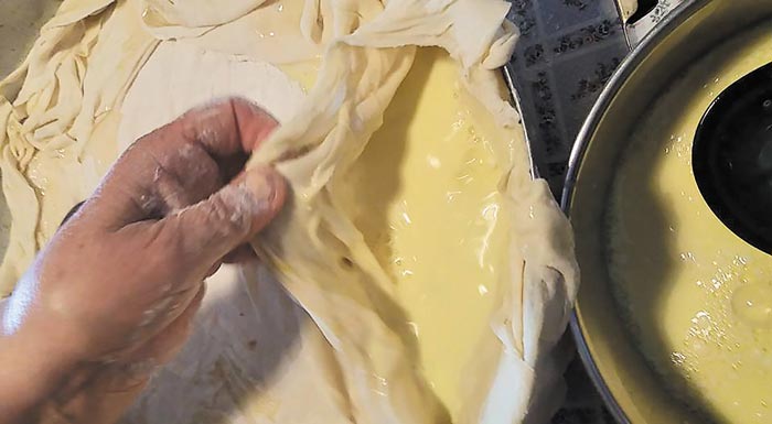 | ΠΡΟΣΟΧΗ: Στη μέση της πίτας, στο πέμπτο φύλλο, μόνο λίγο αλεύρι. Συνεχίζουμε με τα υπόλοιπα πέντε τα οποία ραντίζουμε με λίγο λαδάκι. |