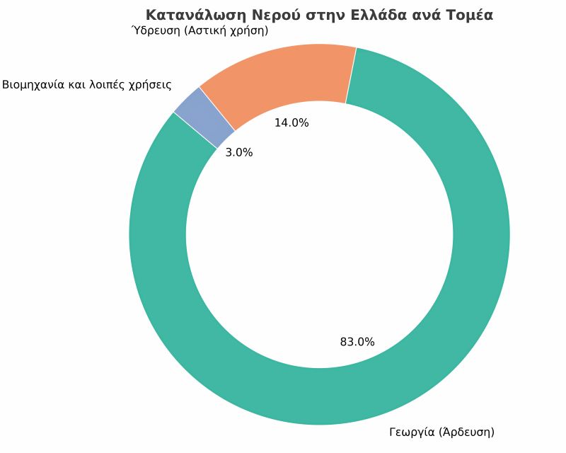 Ο αγροτικός τομέας, ως ο μεγαλύτερος καταναλωτής νερού στη Μεσόγειο και στη χώρα μας (βλ. διάγραμμα), καλείται σήμερα να ενσωματώσει σύγχρονες τεχνικές και τεχνολογίες, προκειμένου να λαμβάνει τεκμηριωμένες, ταχείες και στοχευμένες αποφάσεις. Η ευφυής γεωργία αναδύεται ως μια ολοκληρωμένη μεθοδολογική προσέγγιση που συνδυάζει την αγροτεχνογνωσία με την ψηφιακή καινοτομία, ενισχύοντας αφενός την αποτελεσματική διαχείριση του αρδευτικού νερού και αφετέρου τη βιωσιμότητα των καλλιεργητικών πρακτικών.