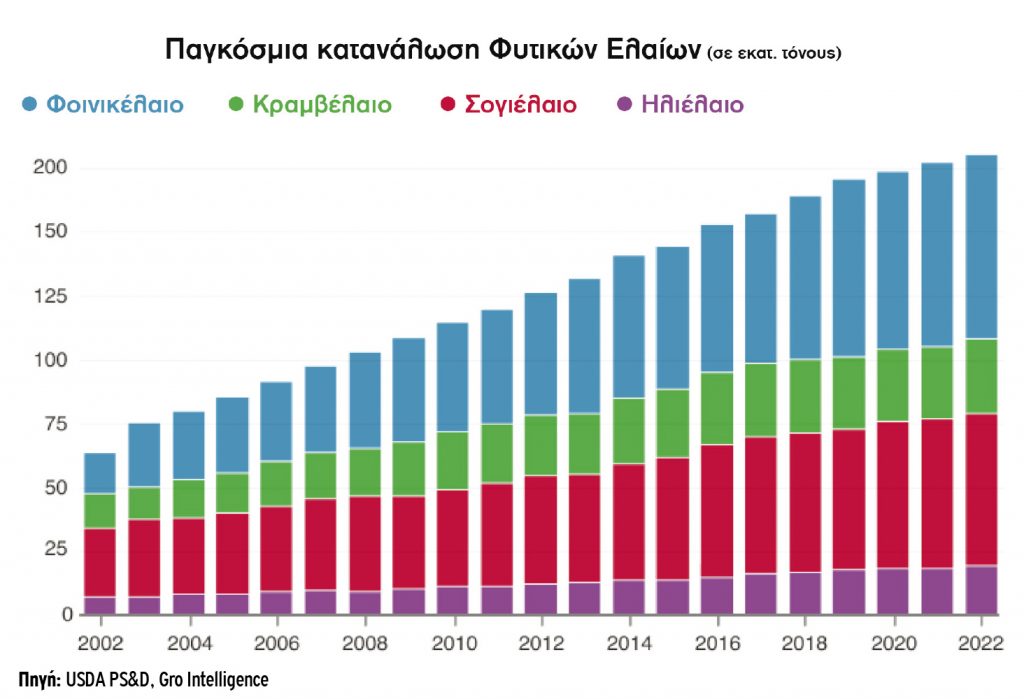Σύμφωνα με τα στοιχεία που παραθέτει η Gro Intelligence, στη διάρκεια των προηγούμενων δέκα ετών, η παγκόσμια παραγωγή φυτικών ελαίων αυξανόταν μεσοσταθμικά κατά 5,7 εκατ. τόνους κάθε χρόνο, φτάνοντας το 2021 τους 206 εκατ. τόνους.