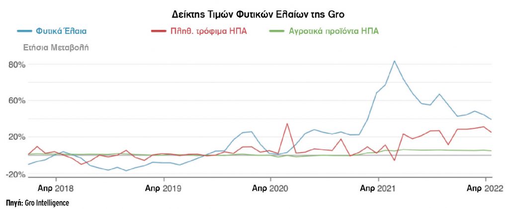 Μιλώντας με αριθμούς, οι τιμές στο σογιέλαιο αυξήθηκαν 8% μετά την έναρξη του πολέμου και στο τέλος του Μαρτίου κατέγραφαν άνοδο 58% σε ετήσια βάση. Αντίστοιχα, στο φοινικέλαιο, στο τέλος του Μαρτίου 2022 οι τιμές ήταν αυξημένες κατά 58% σε σύγκριση με έναν χρόνο πριν, έχοντας «πάρει» 15% μετά το ξέσπασμα της ουκρανικής κρίσης. Στις ΗΠΑ, ένα «καλάθι» φυτικών ελαίων, που χρησιμοποιούνται κατά κόρον από τη βιομηχανία τροφίμων, κόστιζε στο τέλος του Μαρτίου 45% παραπάνω σε σχέση με έναν χρόνο πριν, υπερβαίνοντας κατά πολύ την αύξηση του πληθωρισμού στα τρόφιμα στο ίδιο διάστημα.