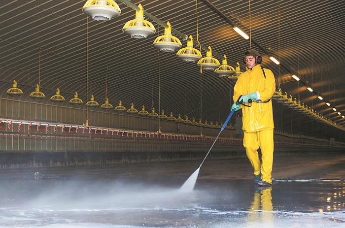 4 Πλύσιμο του χώρου και καθαρισμός των συστημάτων διατροφής. Σε αυτήν τη φάση χρησιμοποιούνται μηχανή πλυσίματος με πίεση και αφρώδες απορρυπαντικό. Το απορρυπαντικό πρέπει να είναι συμβατό με το απολυμαντικό που θα χρησιμοποιηθεί, ενώ στο τέλος ο καθαριστής ξεπλένει με καυτό νερό, για να απομακρύνει τυχόν ουσίες επιβλαβείς για τις όρνιθες.