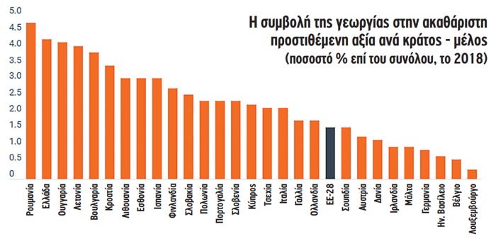 Παρά την πτωτική τάση σε ευρωπαϊκό επίπεδο, κράτη-μέλη της Ανατολικής και Νότιας Ευρώπης εξακολουθούν να παρουσιάζουν πιο υψηλά ποσοστά από τον μέσο ευρωπαϊκό όρο. Πιο συγκεκριμένα, ο πρωτογενής τομέας στη Ρουμανία συμβάλλει στην εγχώρια ακαθάριστη προστιθέμενη αξία (GVA) κατά 4,9%, στην Ελλάδα κατά 4,3%, στην Ουγγαρία κατά 4,2%, στη Λετονία κατά 4,1% και στη Βουλγαρία κατά 3,9%. Αντίθετα, το ποσοστό αυτό παρέμεινε κάτω από το 1% για τις μεγαλύτερες οικονομίες της Δυτικής Ευρώπης: 0,9% της Γερμανίας, 0,7% του Ηνωμένου Βασιλείου, 0,6% του Βελγίου και 0,3% του Λουξεμβούργου.