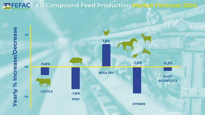 Στις τελευταίες της προβλέψεις, η FEFAC (Ευρωπαϊκή Συνομοσπονδία Βιομηχανιών Ζωοτροφών) τοποθετεί χαμηλά τον πήχη για το 2024, προεξοφλώντας μείωση, έστω και οριακή του συνολικού τονάζ, κατά 0,3% σε σχέση με τους 147 εκατ. τόνους του 2023.