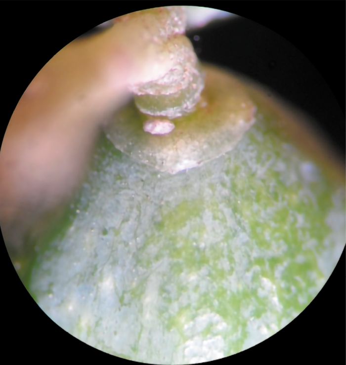 Σε αυτό το στάδιο, τρέφεται με νεαρές ταξιανθίες και μπορεί να προκαλέσει σημαντική οικονομική ζημιά. Κατόπιν, νυμφώνεται και από τα τέλη Μαρτίου και όλο τον Απρίλιο εμφανίζονται τα ενήλικα της ανθοφάγου ή ανθόβιας γενεάς, τα οποία ωοτοκούν στον κάλυκα των κλειστών ανθέων. Οι προνύμφες εισέρχονται μέσα στο άνθος, όπου τρέφονται με τους ανθήρες και ζημιώνουν τον ύπερο, συνδέοντας τα προσβεβλημένα άνθη μεταξύ τους με μετάξινα νήματα. Όταν ολοκληρώσουν την ανάπτυξή τους, νυμφώνονται και τα ενήλικα ωοτοκούν στον κάλυκα νεαρών καρπών (Εικόνα 2).