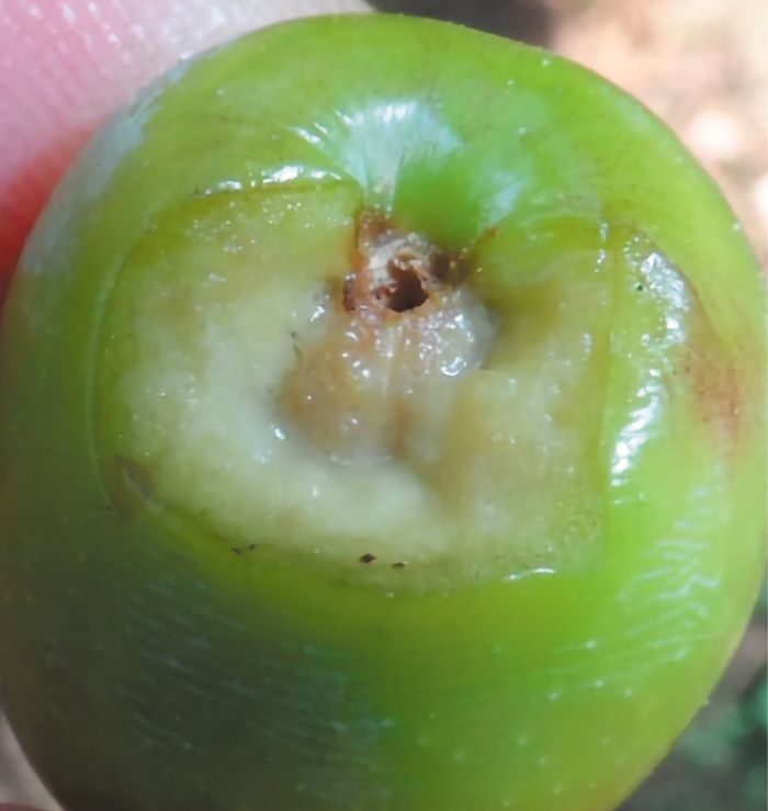 Το θηλυκό ωοτοκεί εντός των καρπών λίγο πριν από τη σκλήρυνση του πυρήνα. Η νεαρή προνύμφη τρέφεται στο ενδοσπέρμιο μέσα στον πυρήνα και όταν ολοκληρώσει την ανάπτυξή της εξέρχεται από τον καρπό ή πέφτει μαζί με αυτόν στο έδαφος, όπου και παραμένει σε χωμάτινο κελί.