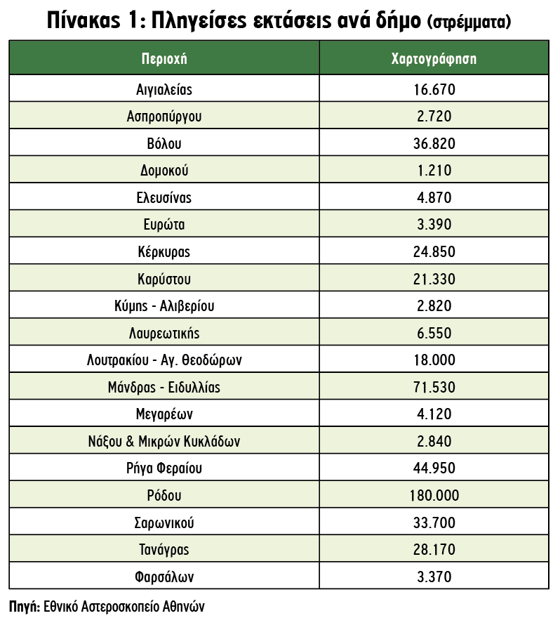 Σύμφωνα με τα στοιχεία που έχει στη διάθεσή της η «ΥΧ», η φωτιά πέρασε από 19 δήμους. Πιο συγκεκριμένα, στον Πίνακα 1 καταγράφονται οι καμένες εκτάσεις του Ιουλίου ανά Καλλικρατικό Δήμο και στον Πίνακα 2 περιλαμβάνονται οι εκτάσεις που κάηκαν ανά ημερομηνία και περιοχή.