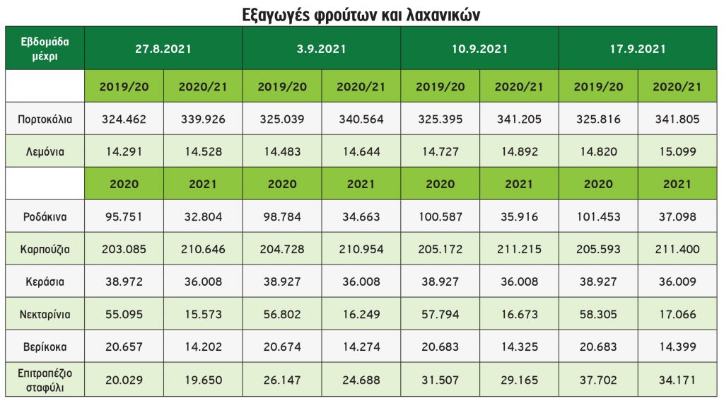 Την ίδια στιγμή, συνεχίζονται οι εξαγωγές των υπόλοιπων θΤερινών φρούτων και μέχρι σήμερα (περίοδος 1/5 έως 17/9) ανέρχονται: α) ων κερασιών σε 36.009 τόνους, μειωμένες κατά 7,5% έναντι πέρσυ, β) των βερικόκκων σε 14.399 τόνους, μειωμένες κατά 30,4% , γ) των ροδακίνων 37.098 τόνους, μειωμένες κατά 63,4%.