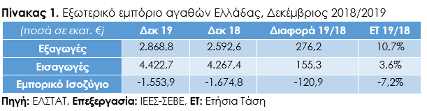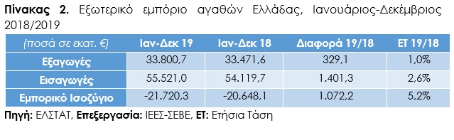 Συνολικά για το 2019, οι εξαγωγές αυξήθηκαν κατά 1,0%, δηλαδή κατά €329,1 εκατ. και ανήλθαν στο ποσό των €33.800,7 εκατ. για πρώτη φορά στην ιστορία, καταρρίπτοντας την επίδοση των €33.471,6 εκατ. του 2018. Αντίστοιχα, οι εισαγωγές διαμορφώθηκαν στο ποσό των €55.521,0 εκατ. έναντι 54.119,7 εκατ. το 2018, με την αύξηση να ανέρχεται σε €1.401,3 εκατ., δηλαδή 2,6%, ενώ η σημαντική ενίσχυση των εισαγωγών είχε ως αποτέλεσμα τη διεύρυνση του εμπορικού μας ελλείμματος κατά €1.072,2 εκατ., δηλαδή 5,2%, με αποτέλεσμα να διαμορφωθεί σε €21.720,3 εκατ.