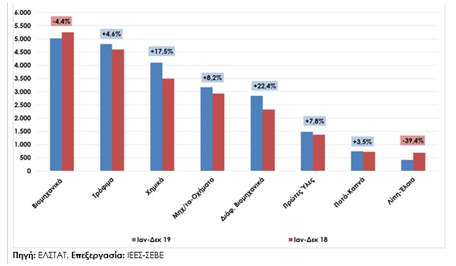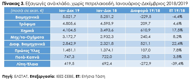 Σε κλαδικό επίπεδο, οι εξαγωγές πετρελαιοειδών παρουσίασαν μείωση κατά 6,3% και διαμορφώθηκαν σε €10.563,1 εκατ. έναντι €11.269,2 εκατ. το 2018, επηρεάζοντας αρνητικά τη συνολική επίδοση των ελληνικών εξαγωγών. Τα βιομηχανικά προϊόντα σημείωσαν μείωση εξαγωγών κατά €229,5 εκατ., δηλαδή 4,4% και διαμορφώθηκαν σε €5.021,7 εκατ., ενώ αρνητική συνεισφορά είχανε και οι εξαγωγές λιπών και ελαίων, καθώς μειώθηκαν κατά €272,9 εκατ., δηλαδή 39,4% και ανήλθαν σε €419,5 εκατ. Αντίθετα, σημαντική αύξηση σημείωσαν οι εξαγωγές τροφίμων κατά €209,7 εκατ., δηλαδή 4,6%, χημικών προϊόντων κατά €610,9 εκατ., δηλαδή 17,5%, μηχανημάτων και οχημάτων κατά €240,4 εκατ., δηλαδή 8,2%, διάφορων βιομηχανικών προϊόντων κατά €521,1 εκατ., δηλαδή 22,4%, πρώτων υλών κατά €107,0 εκατ., δηλαδή 7,8% και ποτών και καπνών κατά €25,3 εκατ., δηλαδή 3,5%.
