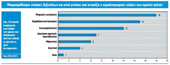 Αυτό, τη στιγμή που η ανάπτυξη νέων και δη ψηφιακών δεξιοτήτων καθίσταται αναγκαία, μεταξύ άλλων και λόγω της γήρανσης του αγροτικού πληθυσμού, αλλά και της ολοένα αυξανόμενης αυτοματοποίησης –συνθήκες που αποτυπώνονται στην πρόβλεψη για μείωση κατά 27% του εργατικού δυναμικού που θα απασχολείται στον κλάδο μέχρι το 2023. Όπως αναφέρει ο ΟΟΣΑ, η στρατηγική επένδυση στη γνώση και στην αγροτική καινοτομία είναι επίσης επιτακτική, στο πλαίσιο του «πράσινου» μετασχηματισμού της ευρωπαϊκής γεωργίας.
