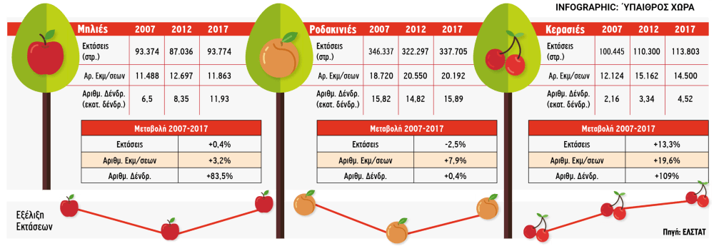 Στον αντίποδα, φωτεινή είναι η εικόνα, ιδιαίτερα στα μήλα, αλλά σε μικρότερο βαθμό και στα κεράσια, αν παρατηρήσουμε ειδικότερα την εξέλιξη του αριθμού των δέντρων που φυτεύονται. Πιο χαρακτηριστική περίπτωση είναι η καλλιέργεια της μηλιάς, που σε σχέση με το 2007 και τα 6,5 εκατομμύρια δέντρα, δέκα χρόνια αργότερα φυτεύονταν 11,9 εκατ. δέντρα περίπου στις ίδιες εκτάσεις.