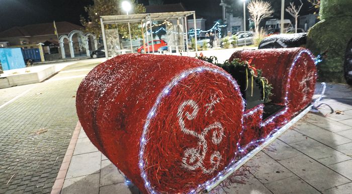 Ένα τρακτέρ, ένα έλκηθρο, μια φάτνη και μπόλικες γιορτινές, χριστουγεννιάτικες φιγούρες συνθέτουν μια οικολογική και καλαίσθητη θεματική δημιουργία. Είναι κατασκευασμένα με 35 μπάλες άχυρου, που οι ισχυροί άνεμοι και οι καταιγίδες δεν στάθηκαν ικανά να τα μετακινήσουν.