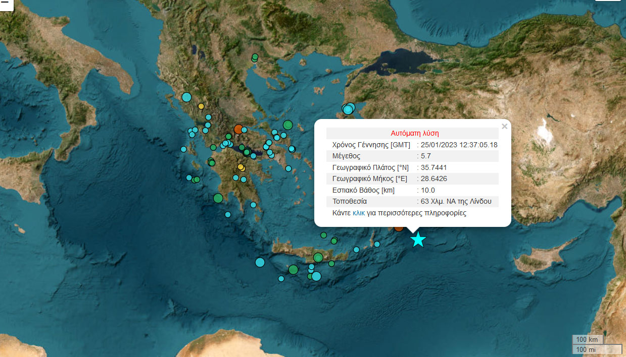 Ισχυρός σεισμός με διάρκεια σημειώθηκε πριν λίγο στη Ρόδο. Σύμφωνα με τα στοιχεία ήταν έντασης 5,9 βαθμών της κλίμακας Ρίχτερ, 65 χιλιόμετρα νοτιοανατολικά της Λίνδου. Αρχικά το Γεωδυναμικό Ινστιτούτο ανέφερε προκαταρκτικό μέγεθος 5,7 Ριχτερ για να το διορθώσει λίγο αργότερα στα 5,9 Ρίχτερ.