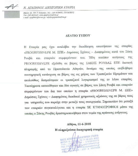 Η Εταιρία μας έχει αναλάβει την διεκδίκηση των απαιτήσεων «PROGRESSIVEPR M.EΠΕ» Δημόσιες Σχέσεις – Διαφημίσεις κατά του Σάκη Ρουβά και εταιριών συμφερόντων του. Ήδη κατόπιν αιτήσεως της «PROGRESSIVEPR M.EΠΕ» εξεδόθη σε βάρος της Σάκης Ρουβάς ΕΠΕ διαταγή πληρωμής από το Πρωτοδικείο Αθηνών, δυνάμει της οποίας επιβλήθηκε συντηρητική κατάσχεση σε βάρος της εις χείρας των τραπεζικών ιδρυμάτων και ακολούθως δεσμεύθηκαν οι τραπεζικοί λογαριασμοί της εν λόγω εταιρίας.