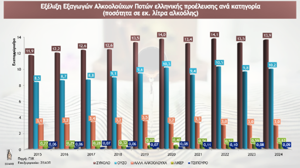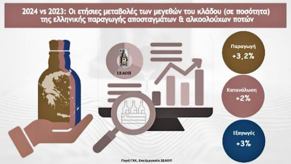 Η ελληνική ποτοποιία και αποσταγματοποιία φαίνεται να ξαναπαίρνει την ανοδική της πορεία το 2024, μετά την πτώση του 2023, σύμφωνα με τα πρόσφατα στοιχεία που ανακοίνωσε ο Σύνδεσμος Ελλήνων Παραγωγών Αποσταγμάτων Αλκοολούχων Ποτών (ΣΕΑΟΠ). Η παραγωγή, η κατανάλωση και οι εξαγωγές ελληνικών αλκοολούχων ποτών κατέγραψαν σημαντική αύξηση, επιβεβαιώνοντας την ανθεκτικότητα και την ισχυρή εξαγωγική δυναμική του κλάδου, ακόμη και σε ένα περιβάλλον γεμάτο προκλήσεις, όπως σημειώνει ο Σύνδεσμος.