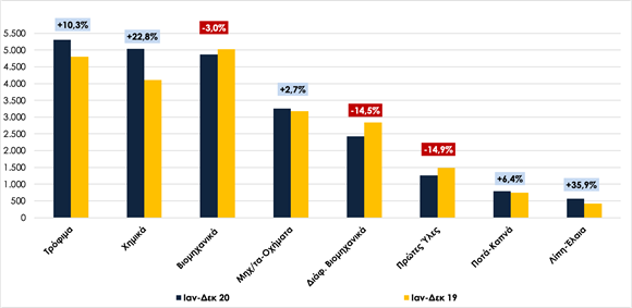 Γράφημα 1. Μεταβολή κυριότερων κλάδων, χωρίς πετρελαιοειδή, Ιανουάριος-Δεκέμβριος 2019/2020