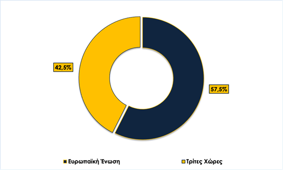 Αναφορικά με τις χώρες όπου αποστέλλονται τα ελληνικά προϊόντα, τα κράτη-μέλη της Ευρωπαϊκής Ένωσης (27) κατέχουν το μεγαλύτερο μερίδιο (57,5% συνολικά και 65,1% χωρίς τα πετρελαιοειδή), ενώ οι Τρίτες Χώρες έχουν σαφώς μικρότερο μερίδιο (42,5% συνολικά και 34,9% χωρίς τα πετρελαιοειδή) με το 36% των εξαγωγών προς Τρίτες Χώρες να αφορά στα πετρελαιοειδή.