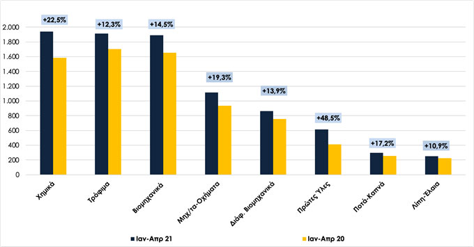 Γράφημα 1. Μεταβολή κυριότερων κλάδων, χωρίς πετρελαιοειδή, Ιανουάριος-Απρίλιος 2020/2021