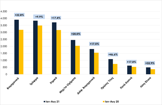 Γράφημα 1. Μεταβολή κυριότερων κλάδων, χωρίς πετρελαιοειδή, Ιανουάριος-Αύγουστος 2020/2021
