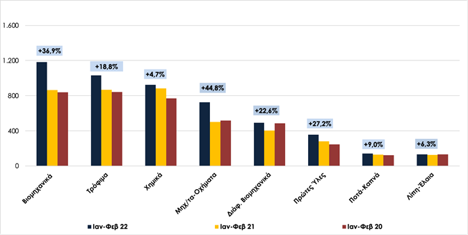 Η ανοδική πορεία των ελληνικών εξαγωγών στο σύνολό τους διαμορφώθηκε από την ιδιαίτερα θετική πορεία όλων των επιμέρους κλάδων, τόσο σε σχέση με το 2021, όσο και με το 2020. Αναλυτικά, ανοδική πορεία κατέγραψαν οι εξαγωγές βιομηχανικών (€318,8 εκατ., δηλαδή 36,9%), τροφίμων (€163,0 εκατ., δηλαδή 18,8%), χημικών (€41,5 εκατ., δηλαδή 4,7%), μηχανημάτων και οχημάτων (€224,1 εκατ., δηλαδή 44,8%), διάφορων βιομηχανικών (€90,9 εκατ., δηλαδή 22,6%), πρώτων υλών (€76,1 εκατ., δηλαδή 27,2%), ποτών και καπνών (€11,7 εκατ., δηλαδή 9,0%), λιπών και ελαίων (€7,9 εκατ., δηλαδή 6,3%) και μη ταξινομημένων προϊόντων (€46,2 εκατ., δηλαδή 68,8%).